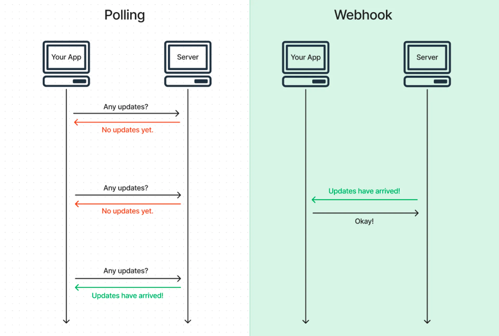 이러한 결제 방식에서, 고객이 입금을 완료했는지를 실시간으로 확인하기 위해 폴링 방식을 사용하는 것은 비효율적입니다. 입금 시점 전까지 반복적으로 대역폭을 불필요하게 소모하고, 서버에 부담을 주며, 결제 확인에 대한 지연을 초래하기 때문입니다. 반면, 웹훅을 사용하면 입금이 확인되는 즉시 서버에서 고객사의 지정된 웹훅 URL로 알림을 보냄으로써 이러한 비효율을 없앨 수 있습니다.