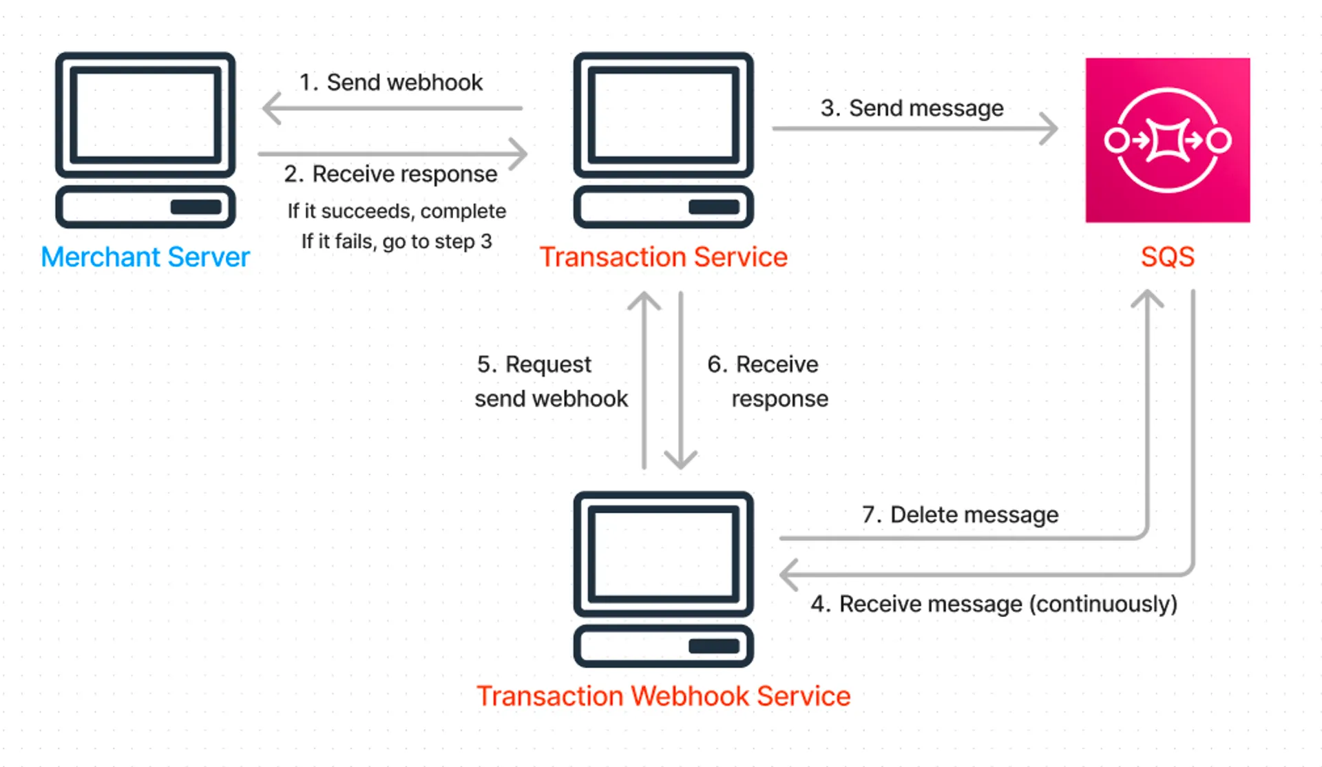 Transaction Service는 V2 시스템에서 결제의 코어 기능을 담당하는 컴포넌트이며 실질적으로 웹훅을 발송하는 주체입니다. 그리고 Transaction Webhook Service 는 SQS를 구독하여 웹훅 재전송을 위한 단순한 로직을 반복하는 작은 컴포넌트입니다. 이 컴포넌트가 하는 작업은 SQS에 처리할 메시지가 있는지 지속적으로 확인하고, 만약 메시지가 있으면 Transaction Service로 웹훅 재전송을 요청한 뒤 메시지를 삭제하는 것이 전부입니다. 즉, 웹훅의 발송을 담당하는 컴포넌트와 메시지 큐를 폴링하여 전달하는 컴포넌트가 협업하는 구조입니다.